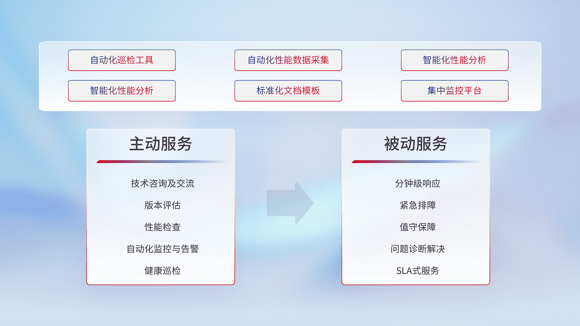 智能化工具和标准化文档,,,保障服务质量,,提供主动服务(包含技术咨询、、、、版本评估、、、、性能检查、、自动化监控与告警、、、、健康巡检)和被动服务包含(分钟级响应、、、紧急排障、、、、值守保障、、问题诊断解决、、、、SLA服务)。。。。