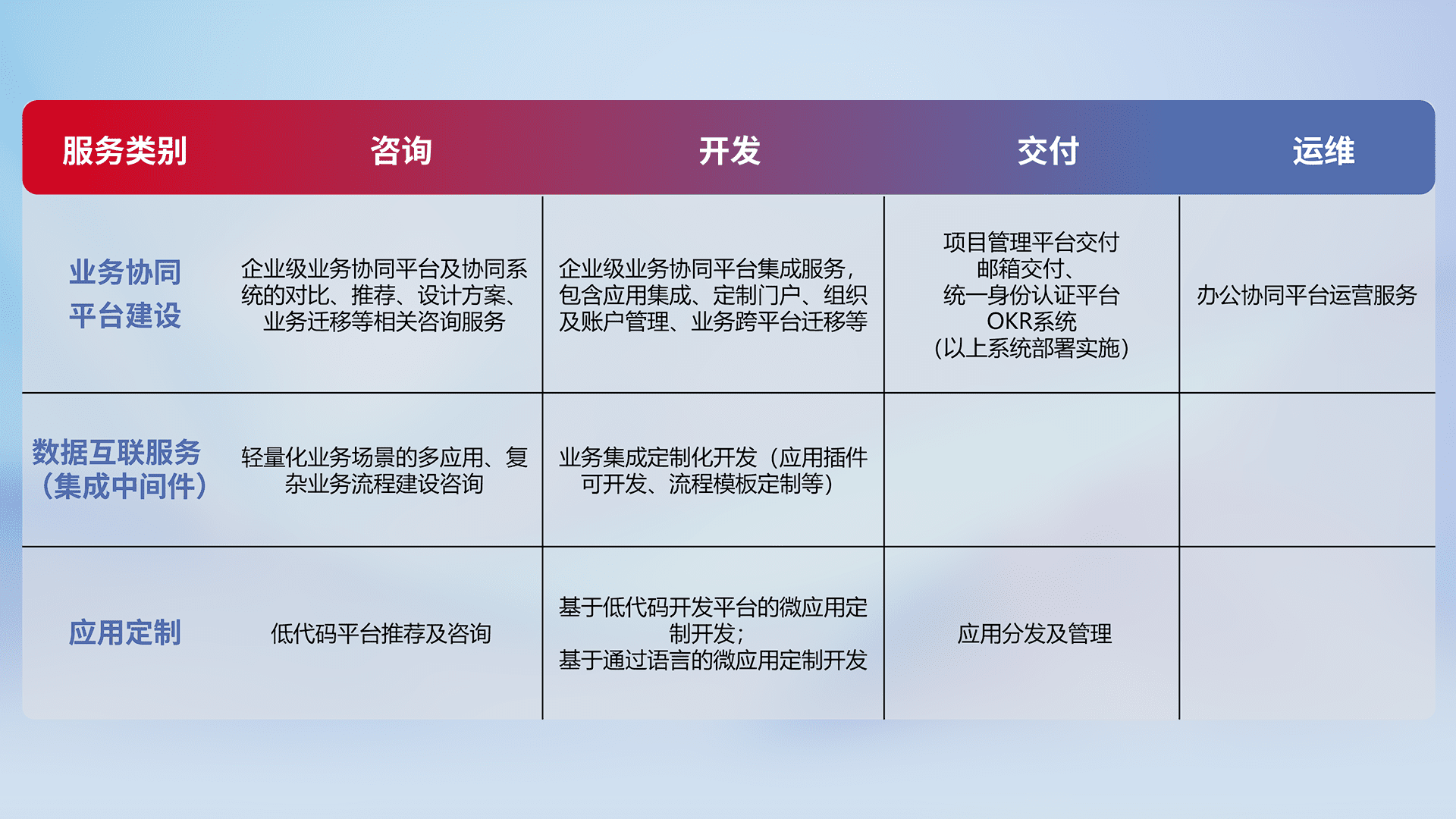 针对钉钉、、、企微、、IDaas等平台级产品提供产品的规划、、、方案、、交付、、、、定制化开发等服务,,,,实现如统一协同办公、、智能客户服务、、、混合会议管理、、、智能数据查询、、等业务场景,,,,实现数字化转型。。。
